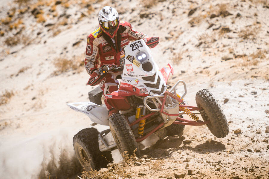 Krakowianin po środowej kraksie nie miał zbyt dobrej pozycji startowej i na mierzący 454 km odcinek specjalny wyjechał w towarzystwie słabszych motocyklistów i drugiej dziesiątki quadów. - Jak mówi piosenka: ostatnich gryzą psy. Ta sama zasada obowiązuje tutaj, bo kiedy jedzie się w drugiej części stawki w powietrzu jest już bardzo dużo piachu i pyłu. W fesz feszu istnieje ogromne zagrożenie uderzenia w jakiś samotny głaz, a niebezpieczeństwo stwarzają także słabsi zawodnicy. Dlatego dziś byłem cały czas bardzo skupiony i tam gdzie wyprzedzanie było ryzykowne, odpuszczałem. Za jednym rywalem jechałem chyba około 20 km, bo nie chciał mnie przepuścić, mimo że widział, iż jadę mocniejszym od niego tempem. To niestety spowalnia i nie pozwala złapać odpowiedniego rytmu. Na Dakarze trzeba się jednak nauczyć cierpliwości – mówił Sonik.