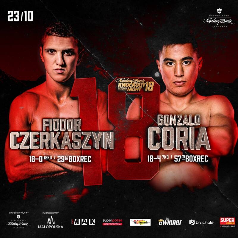 W walce wieczoru Nosalowy Dwór Knockout Boxing Night 18 zmierzą się polsko-ukraiński diament wagi średniej Fiodor Czerkaszyn (18-0, 12 KO) oraz wysoko klasyfikowany w światowym rankingu Argentyńczyk Gonzalo Coria (18-4, 7 KO). Na ringu zbudowanym w Centrum Kongresowym „Gerlach” należącym do Nosalowy Dwór Resort & SPA kibice zobaczą także byłego mistrza Europy oraz czołowego pięściarza świata wagi junior ciężkiej Mateusza Masternaka (45-5, 30 KO). Jego przeciwnikiem będzie Albańczyk Armend Xhoxhaj (12-1, 7KO).