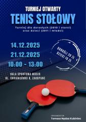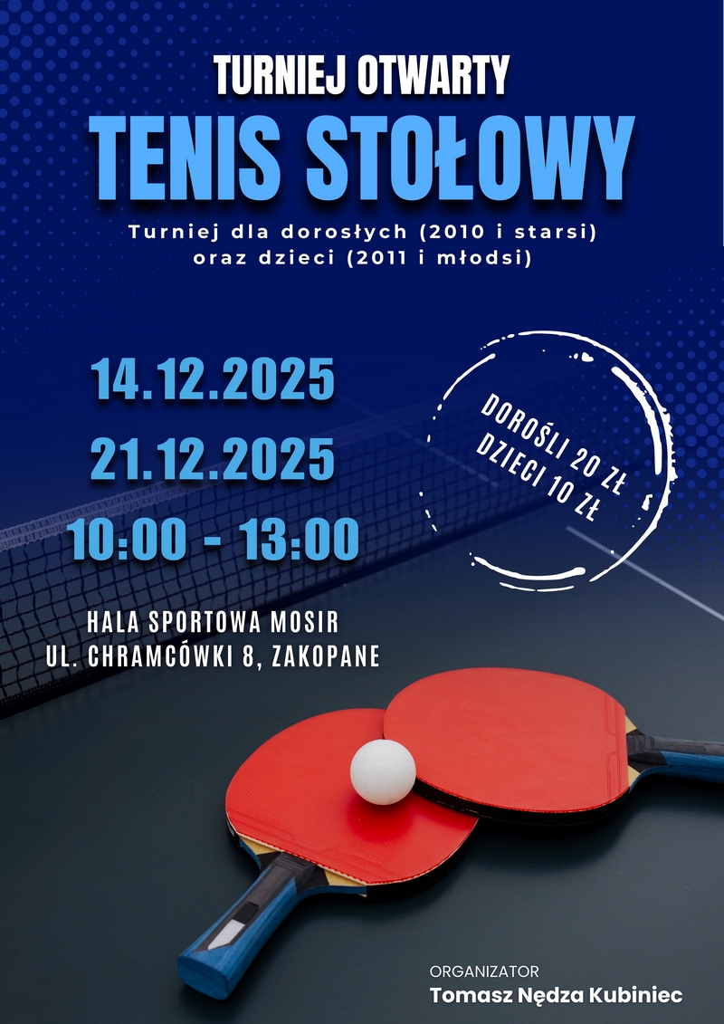Zapraszamy na otwarty turniej tenisa stołowego dla dorosłych oraz dzieci, startujemy już 14.12.2025 od godziny 10:00. Kolejne spotkanie 21.12 w listopadzie.
