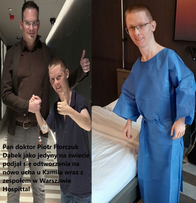 Kamil opowiada:„Operacja w Hospittal w Warszawie wniosła w moje życie ogromną radość i szczęście. Mam nowe ucho – jest jeszcze obrzęknięte, ale zaczyna nabierać kształtu i już po mału odstaje od czaszki tak, jak powinno być. Pobranie chrząstki z żebra, wyrzeźbienie ucha i wszczepienie go na czaszkę to mistrzostwo świata przy tym naprawienie tkanek. Przeszczepy się przyjęły i wszystko się goi."Po operacji ani nie wymiotowałem ani nie miałem żadnych odgniotów na kości ogonowej ani na stopie mistrzostwo świata jak się mną zajeli w Szpitalu Hospittal na Ząbkowskiej we Warszawie.Skrót tej niezwykłej operacji można oglądnąć pod tym 2 linkami https://www.facebook.com/reel/839739005644954 i tez pod tym linkiem https://www.instagram.com/p/DReUixmDBcU/