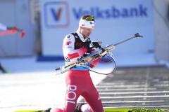 W rywalizacji mężczyzn najlepiej z Polaków zaprezentował się Andrzej Nędza-Kubiniec. Zanotował 17. miejsce, popełnił dwa błędy na strzelnicy i do zwycięzcy stracił 3 minuty i 31,7 sekundy. W czołowej trzydziestce znalazł się także Wojciech Skorusa. Trzy niecelne strzały dały mu 25. pozycję ze stratą 3:57,2. Na 30. miejscu zawody ukończył Marcin Zawół. Cztery pudła kosztowały go łącznie trzy minuty kary, a jego strata wyniosła 4:03,5. W stawce znalazł się również Kacper Brzóska, który uplasował się na 86. pozycji.