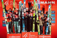 Nieudanie zawody rozpoczęli faworyci konkursu. Japonia po skoku Sary Takanashi (103,5 m) zajmowała ostatnie, dziewiąte miejsce. Lepiej spisali się Ren Nikaido (134,5 m), Nozomi Maruyama (124 m) i Ryoyu Kobayashi (128 m). Tym samym Azjaci zakończyli rywalizację na najniższym stopniu podium.