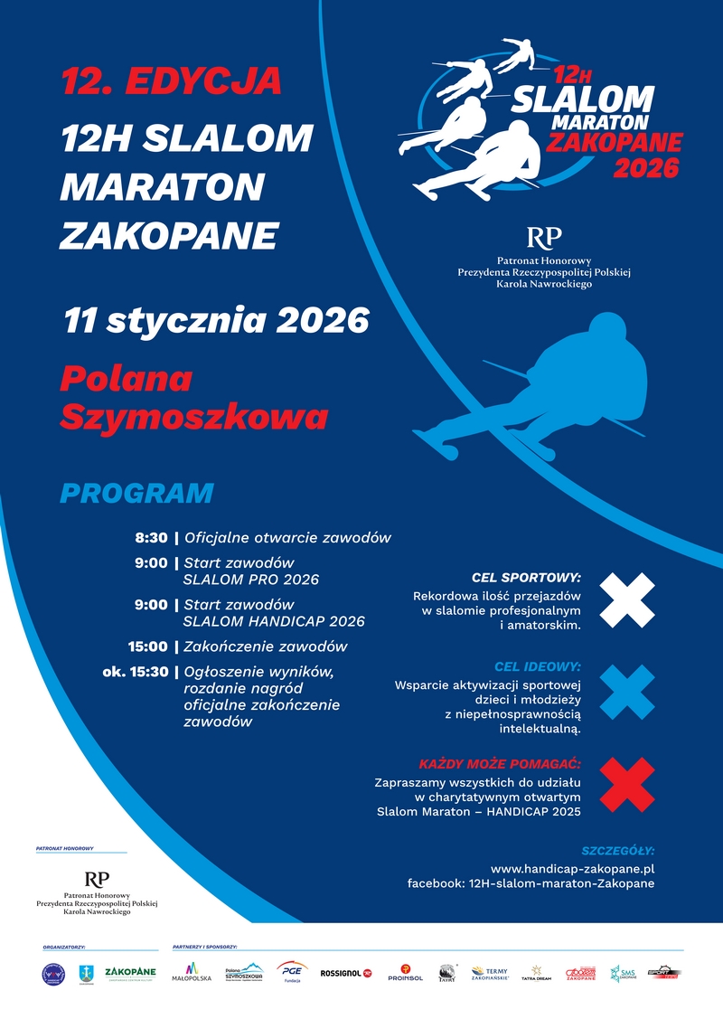 12. edycja 12H Slalom Maraton Zakopane odbędzie się 11 stycznia 2026 roku na Polanie Szymoszkowej. Wydarzenie, organizowane od 2015 roku, po raz kolejny połączy sportową rywalizację z ideą wspierania aktywizacji sportowej osób z niepełnosprawnościami.