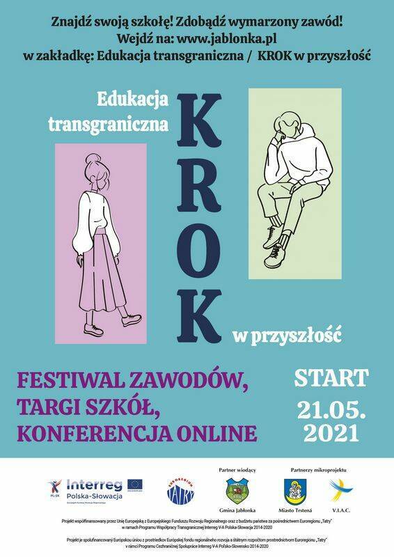 W ramach realizacji mikroprojektu „Edukacja transgraniczna – KROK w przyszłość” 21 maja 2021 roku odbędą się: prezentacja online szkół średnich, festiwal zawodów online oraz konferencja online skierowane do uczniów klas 7 i 8 szkół podstawowych Gminy Jabłonka. Projekt został przygotowany  z myślą o młodzieży kończącej naukę w szkołach podstawowych. Uczniowie będą mogli uzyskać wszystkie niezbędne informacje dotyczące dalszej ścieżki edukacji. Zostaną omówione zasady rekrutacji, oferty placówek edukacyjnych, możliwości kształcenia w konkretnych zawodach.