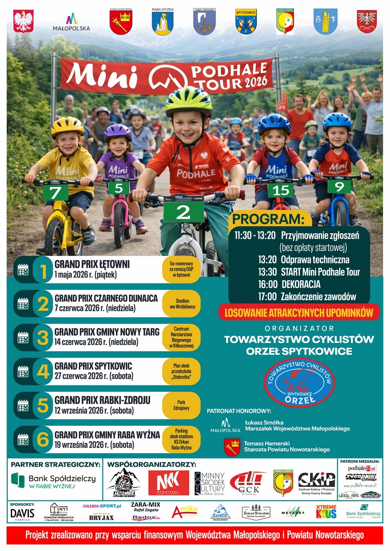 Partnerem strategicznym Mini Podhale Tour 2026, jest Bank Spółdzielczy w Rabie Wyżnej. Serdecznie zapraszamy wszystkich do udziału i kibicowania – do zobaczenia na starcie! Regulamin na: www.tcorzel.pl